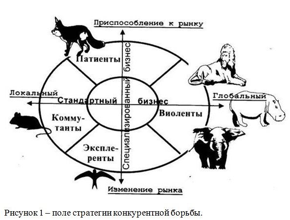 Классик современности Портер выделял 3 стратегии: ориентация на снижение издержек, дифференциацию продукции и фокусирование. Отойдем от классического понимания конкурентных стратегий и рассмотрим их в другой интерпретации. Существует по меньшей мере четыре основных типа стратегии конкурентной борьбы, каждый из которых ориентирован на разные условия экономической среды и разные ресурсы, находящиеся в распоряжении предприятия. На рисунке 1 показаны соответствующие им типы компаний: виоленты, коммутанты, патиенты и эксплеренты.