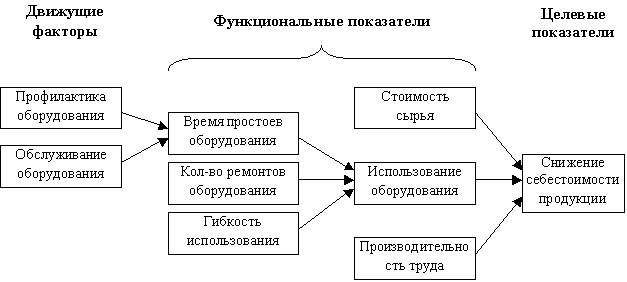 Пример взаимосвязи между целевыми и функциональными показателями изображён на рис. 1, где мы видим последовательность построения причинно-следственной цепочки от движущих факторов и функциональных показателей до конечного (целевого) показателя - снижения себестоимости продукции.