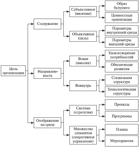 6) цели организации, как и любой системы, формируются под воздействием многих факторов, о чем свидетельствует рис. 12.10, из которого, в частности, следует, что цели могут быть различными по времени достижения и ориентации; по субъектам целеполагания и направленности в пространстве; объективными как свойства любой системы, и субъективными как образ, к которому стремится организация. Степень достижения цели определяется критериями, выбранными для конкретного решения.