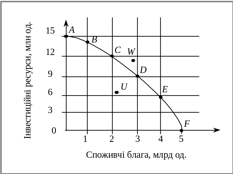Кожна точка на кривій виробничих можливостей рис. 2 являє собою якийсь максимальний обсяг виробництва двох типів продуктів. Таким чином, ця крива фактично показує деяку межу. Усі комбінації інвестиційних ресурсів і споживчих благ на кривій показують максимальні їх кількості, які можуть бути одержані лише в результаті найбільш ефективного використання всіх наявних ресурсів. Точки, що знаходяться за межами кривої, як, наприклад, точка W, недосяжні за даної кількості ресурсів і за даної технології виробництва.