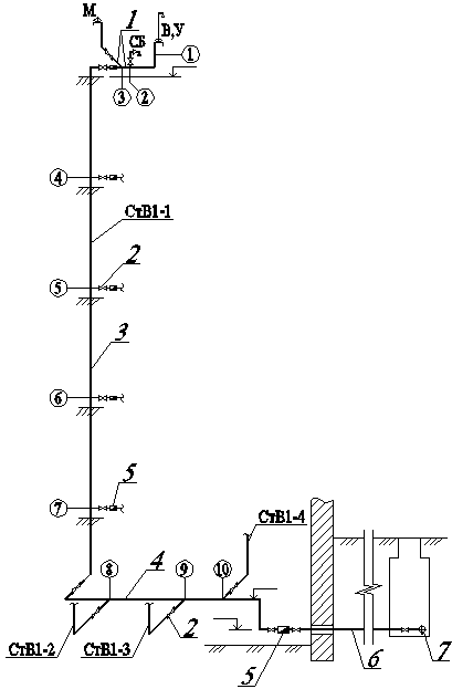 М – мойка, СБ – смывной бачок унитаза, В – ванна, У – умывальник, 1 – подводки к водоразборным устройствам мойки, смывного бачка, ванны, умывальника, 2 – запорная арматура, 3 – стояки, 4 – магистральный трубопровод, 5 – водомеры, 6 – ввод, 7 – наружный водопровод