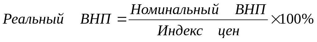 ВНП, рассчитанный в текущих рыночных ценах, называется номинальным. В ценовом выражении ВНП может вырасти, но при этом количество произведенных товаров и услуг в натуральном выражении может не измениться или даже уменьшиться. Такое возможно, если рост цен опережает рост объема производства. Поэтому для определения действительной динамики ВНП используют показатель реального ВНП, то есть, ВНП в неизменных ценах. Реальный ВНП – это номинальный ВНП, очищенный от воздействия инфляции, с учетом индекса цен.