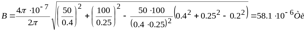 По двум бесконечно длинным прямым параллельным проводам текут токи силой 50 А и 100 А в противоположных направлениях. Расстояние между проводами 0.2 м. Определить магнитную индукцию в точке, удаленной на 0.25 м от первого и на 0.4 м от второго провода.