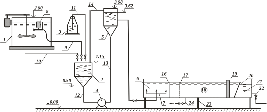 Приготування вихідної води в баці 2 здійснюється шляхом розбавлення концентрованої суміші, яка надходить по трубі 10. Концентрована завись надається за допомогою поплавка-дозатора 8 по трубі 9. Розчин коагулянту подається по гнучкому шлангу 11, на якому встановлений вентиль для регулювання витрати коагулянту. Насос має всмоктувальну і напірну лінії 12 і 13. Для підтримання постійного рівня води в баці 5 вбудована переливна труба 14. Рух води після баку 5 самопливний. Вихідна вода з баку подається в камеру для утворення пластівців по трубі 15, а далі у відстійник. Чиста вода після відстійників відводиться по трубі 22 в резервуар.