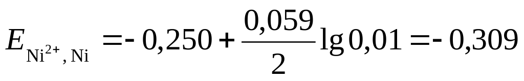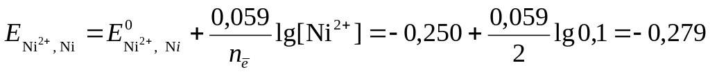 Пример 1. Определите потенциал никелевого электрода, если концентрация ионов Ni2+ в растворе составляет 0,02 н.