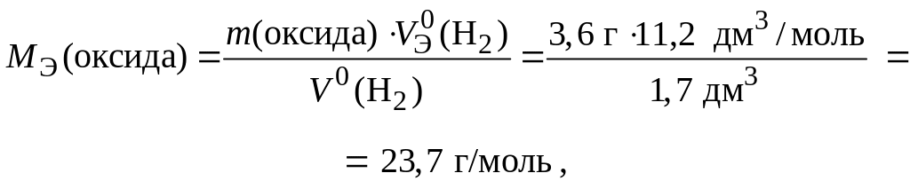 Пример 13. На восстановление 3,6 г оксида металла израсходовали 1,7 дм3 водорода (н.у.). Чему равна молярная эквивалентная масса металла?