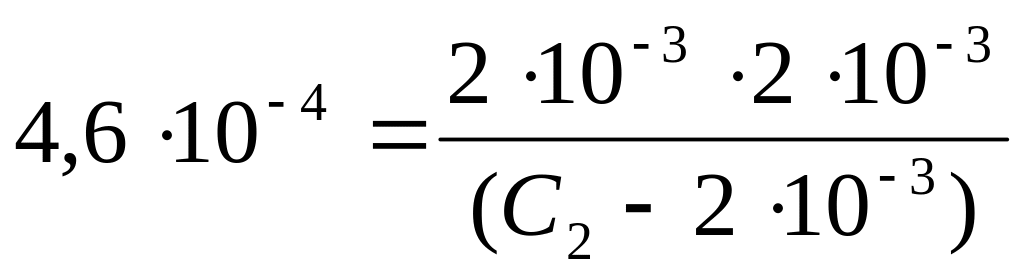 Концентрация молекул кислоты, распавшихся на ионы, также составляет 210–3 моль/дм3. Обозначив исходную концентрацию кислоты через С2 и учитывая, что в начальный момент продуктов диссоциации не было, находим, что в состоянии равновесия концентрация недиссоциированных молекул кислоты равна [НNO2] = (С2 − 210–3) М.