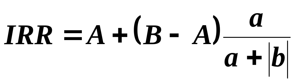 де А – величина ставки дисконту, при якій ЧДД позитивний; В – величина ставки дисконту, при якій ЧДД негативний; а – величина позитивного ЧДД при ставці дисконту А; b – величина позитивного ЧДД при ставці дисконту В.