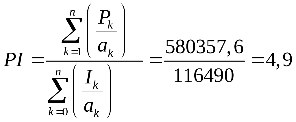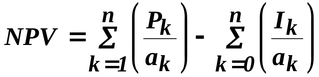 де Pk – грошовий потік за k-тий період (квартал, рік), Ik– загальна сума інвестованих коштів за k-тий період (квартал), аk – коефіцієнт приведення до цін початкового періоду (дисконтуючий множник).