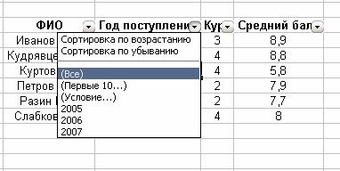 Автофильтр позволяет задать несколько вариантов условия фильтрации по полю