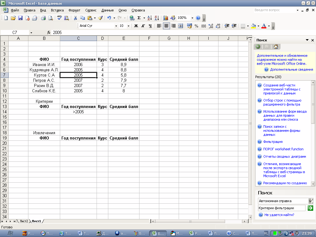 Под критерием понимается условие, заданное с помощью данных, находящихся либо в таблице, либо вводимых пользователем и некоторых операций, в соответствии с которыми производится фильтрация или поиск искомых данных.