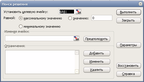 Служит для выхода из окна диалога без запуска поиска решения поставленной задачи. При этом сохраняются установки сделанные в окнах диалога, появлявшихся после нажатий на кнопки Параметры, Добавить, Изменить или Удалить.