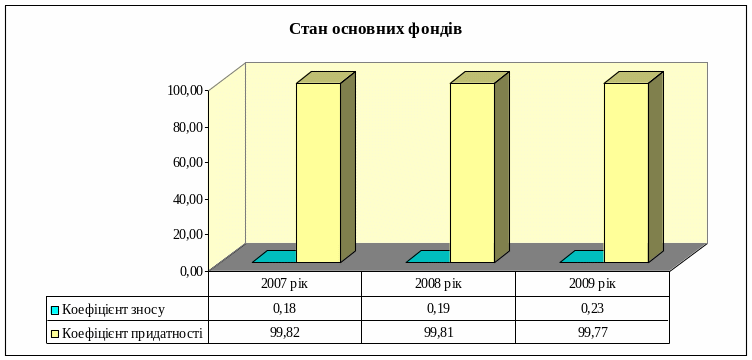 Аналізуючи наведені дані можна говорити про незначне збільшення коефіцієнту зносу протягом 2007–2009 років, але варто зазначити і те, що коефіцієнт придатності є достатньо високим і свідчить про оновлення основних засобів.
