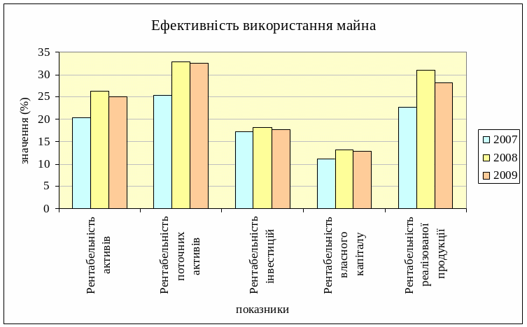 Розрахувавши показники рентабельності за 2007–2009 роки ми спостерігаємо їх зростання, і таке збільшення коливається з 2,98% до 28% в середньому за період, що аналізується. Така динаміка свідчить про покращення ефективності використання активів підприємства. Підприємство повинно докладати всіх зусиль, щоб показники рентабельності надалі тільки зростали.
