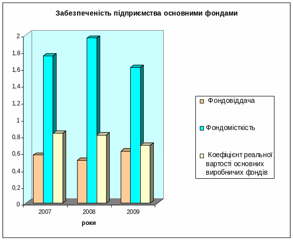 аналізуючи дані за 2009 рік відносно показників 2007 року, слід зазначити, що у 2009 році показник фондовіддачі зріс на 0,05, а показник фондомісткості знизився на 0,14; коефіцієнт реальної вартості активів знизився у 0,14 р. Наведені дані свідчать про позитивні зміни в діяльності підприємства.