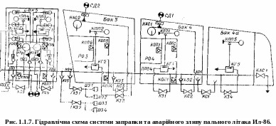 Бортову частину паливопостачання літака, можна розглянути на прикладі літака Ил-86, схема якої показана на рис. 1.1.7. Чотири бортових штуцера Ш31, Ш32, ШЗ3, ЩЗ4, встановлені у зручному для доступа місці (у ніші шасі), приєднані попарно через головні крани заправки ГКЗ1, ГКЗ2 до загального заправного колектора, який проложено вздовж заднього лонжерона крила. Від загального заправного колектора відходять лінії ЦЗ у кожен із баків. Так, у бак 4 із загального колектора паливо надходить через електродистанційний кран КЗ1 та гідравлічний клапан КГ1, який зв’язаний із трубопроводом командного тиску із поплавковим клапаном КПП1.