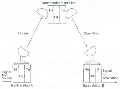 Figure 51.5 represents the communication chain in satellite communication in its simplest form. At one earth station, signals from a source modulate a carrier (M), the carrier is up-converted (U/C) to a radio frequency suitably for the up-link, amplified in a transmitter (Te) and radiated to the satellite receiving antenna. At the satellite, the received carrier is amplified (Rs), changed to the down-link frequency (F/C), amplified in a transmitter (Ts) and radiated to another earth station; this assembly of equipment in the satellite is called a transponder. At that second earth station the down-link carrier is received and amplified (Re), down-converted (D/C) and demodulated (D) so that the signal can be passed to its destination. In practical systems the communication path is often duplex, the return signal channel usually being transmitted through the same satellite transponder. A carrier transmitted from one earth station may be received at many earth stations. There may be several or many other pairs of earth stations passing carriers through the same satellite transponder simultaneously or in sequence, which is called multiple access. There may be other transponders in the satellite, isolated from one another by frequency separation, satellite antenna directivity or polarisation discrimination and relaying different groups of carriers. The techniques which allow satellite communication to be used in these various ways are reviewed later in this chapter.