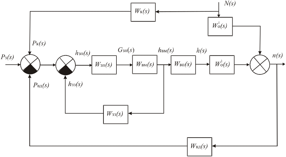 На схемі прийняті позначення передаточних функцій: Wзп(s), Wвм(s), Wрп (s), Wвд(s), W0h (s), W0N(s), Wзз(s), Wк(s) – золотникового підсилювача, виконавчого механізму, регулюючого органу, відцентрового датчика, об’єкта регулювання по каналам дій, що регулюють та збурюють, пристрою зворотного зв’язку, пристрою сигналу, що доповнює (пристрою, що корегує).