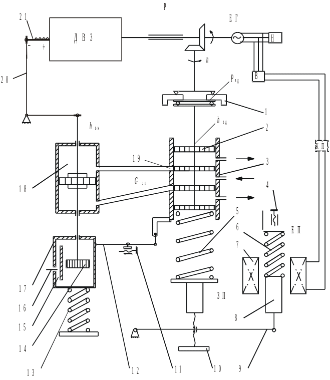 До складу регулятора входять: пристрій, що вимірює – відцентровий датчик обертів вала ДВЗ 1, золотниковий підсилювач, до складу якого входять плунжер – золотник 2 і гільза золотника 3, поршневий двосторонній виконавчий механізм 18, важільний механізм 20, орган, що регулює – рейка паливного насоса 21, пристрій від’ємного зворотного зв’язку 11 – 17, важіль зворотного зв’язку 12, випрямляч В, електромагнітний привід ЕП, що включає котушку 7, плунжер 8, важільну передачу 9, пристрій, що задає, який складається із пружини, що задає 5 і пристрою – гвинт-гайка 10 для зміни стискування пружини 5.