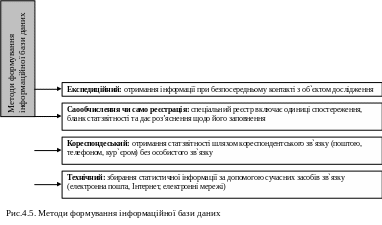 Дані, отримані за допомогою різних джерел інформації, бажано взаємодоповнювати. Особливо це стосується результатів несуцільного обстеження, які потребують доказу їх вірогідності, на відміну від узагальненої інформації, отриманої за допомогою суцільного методу. У процесі збору вихідних даних можна використовувати такі методи формування інформаційної бази даних, як експедиційний, кореспондентський, технічний, само обчислення і само реєстраційні, технічні методи (рис.4.5).