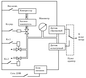 На цепочку из двух тензорезисторов в составе каждого из датчиков давления подается постоянное напряжение от стабилизированного источника, а падение напряжения на измерительном тензорезисторе фиксируется вольтметром.