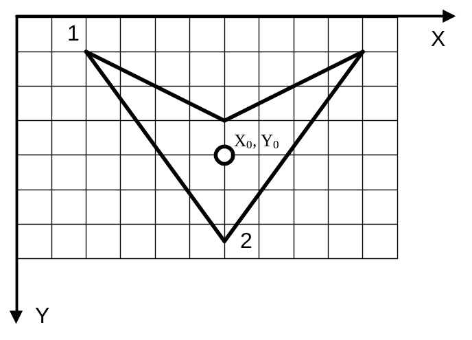 Пусть на рис. 2 кружок обозначает центр траектории с координатами (X0, Y0). Тогда координата точки 1 будет иметь значение (X0 - 4, Y0 - 3), где - размер клетки. Координата точки 2 будет вычисляться как (X0, Y0 + 2,5). Если теперь изменить значение , то изменится масштаб рисования траектории. Расположение центра фигуры (X0, Y0) задает положение траектории в рабочей области моделирования.