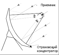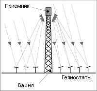 В случае башенных электростанций имеется центральный приемник солнечных лучей внешнего или внутреннего облучения, устанавливаемый на специальной башне и воспринимающий сконцентрированные солнечные лучи ,направляемые на него системой гелиостатов, располагаемых под башней и автоматически поворачивающихся вслед за Солнцем. Каждый такой гелиостат содержит сотни, а иногда и тысячи специально ориентированных зеркал, направляющих падающие на них солнечные лучи на поверхность центрального приемника. Гелиостаты устанавливаются с северной стороны башни или вокруг нее. У центральных приемников внешнего облучения тепловоспринимающие панели расположены на наружной цилиндрической поверхности и полученное здесь тепло идет на выработку и перегрев пара, циркулирующего по трубкам вакуумных коллекторов. В приемниках полостного типа концентрированные лучи направляются внутрь теплоизолированного цилиндрического пространства, образованного трубами с селективной поверхностью, из которых и выполняются испарительная секция, пароперегреватель и экономайзер. Большая часть параь ,вырабатываемого в центральном приемнике, заменяющем собой паровой котел, направляется в многоступенчатую турбину, а избыток его – в систему аккумулирования. Здесь он через специальный теплообменник отдает свое тепло теплоаккумулирующему телу (гравий с пес-ком и минеральное масло). Образовавшийся конденсат через расширительный бак попадает в деаэратор, а оттуда насосом подается снова в центральный приемник