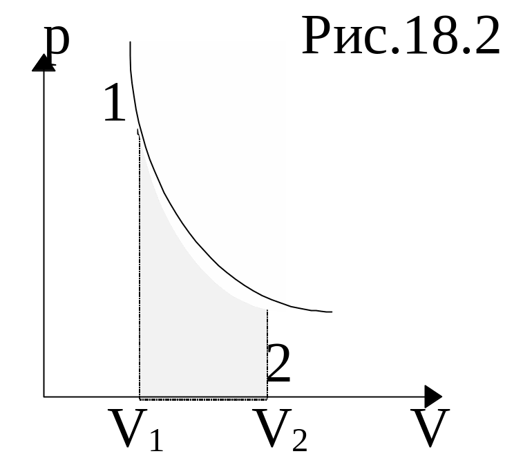 Если газ изотермически расширяется (V2>V1), то к нему подводится тепло, и он совершает положительную работу, которая измеряется площадью, заштрихованной на рисунке фигуры. Если же газ изотермически сжимается (V2<V1), то он совершает отрицательную работу (то есть над ним совершают работу внешние силы).