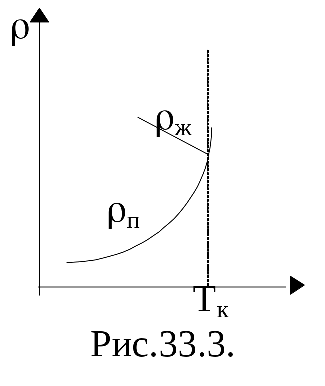 Газ, занимающий весь объем сосуда, является ненасыщенным паром. При сжатии объем его непрерывно растет уменьшается, а плотность растет. После начала конденсации в сосуде имеется и жидкость, и насыщенный пар, который имеет плотность, зависящую только от температуры. Поэтому при изотермическом уменьшении объема, предоставленного пару, он частично конденсируется, но плотность его не изменяется. На рис. 33.3 показана зависимость от температуры плотности жидкости и ее насыщенного пара. При критической температуре обе плотности сравниваются, различие в свойствах жидкости и пара исчезает.