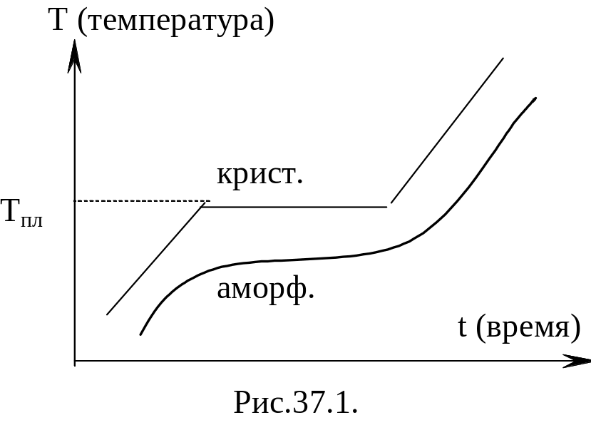 2. Второй характерный признак, отличающий кристаллы от аморфных тел, – это поведение при расплавлении. Пусть тело равномерно нагревается и количество подводимого тепла постоянно. Тогда графически поведение будет выглядеть следующим образом.