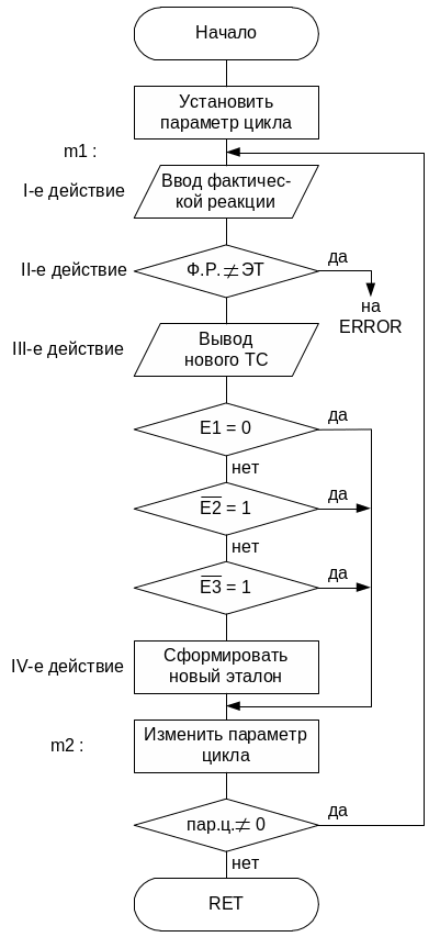 - сравнение ФР с эталоном с последующим ветвлением, а именно, если ФР равно эталону, переход к следующему действию в теле цикла, в противном случае выход из процесса проверки;