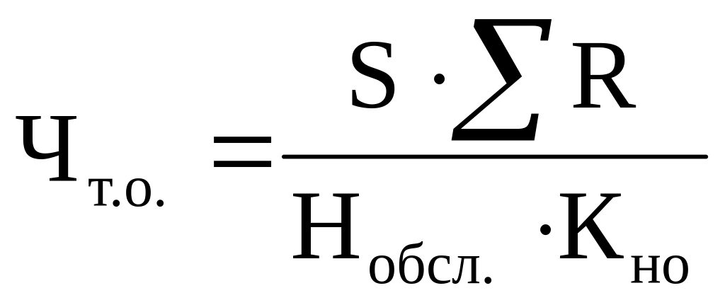 Пример. В цехе установлено 500 единиц технологического оборудования, режим работы – двухсменный. Средняя ремонтосложность единицы оборудования для механической части – 12,3. Норма обслуживания на одного слесаря – 600 единиц ремонтосложности, коэффициент выполнения норм обслуживания – 1,2. Тогда численность дежурных слесарей для проведения ТО равна: (2 × 500 × 12,3) : (600 × 1,2) = 17 чел.
