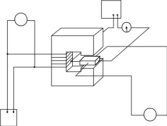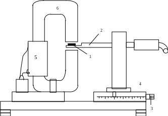 Датчик Холла (2) размером 2 * 1,5 * 0,3 мм на держателе помещен в зазор сердечника электромагнита (рис .12) . Положение датчика в зазоре может регулироваться микрометрическим винтом. Питание датчика осуществляется от другого источника постоянного тока G2.