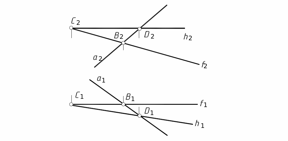 22.2. По линиям связи (см. задачу 1 п. 1.3) находим проекции точек пересечения, принадлежащие обеим прямым уровня и прямой а:: точка В для h и точка D для f (рис. 43)