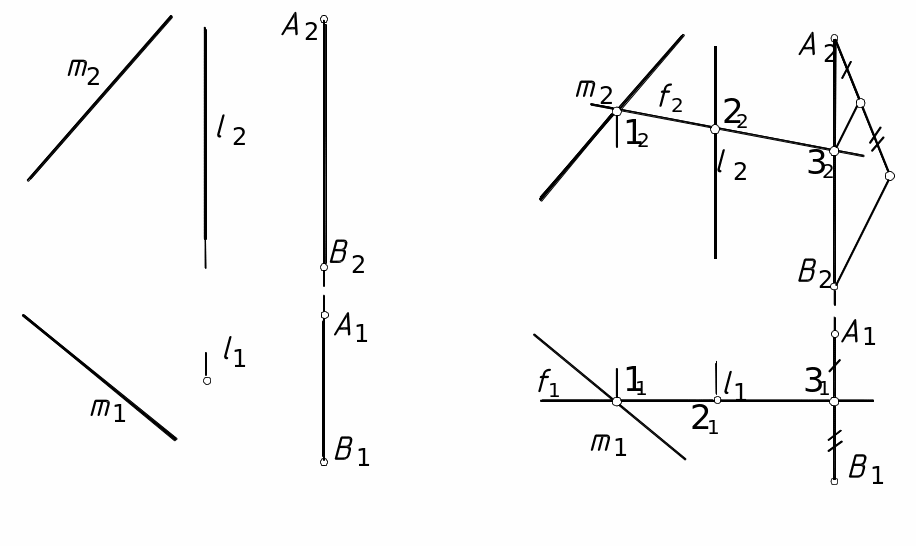 26. Провести фронталь f, пересекающую m и l, и отрезок АВ (рис. 51, а).