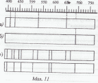 На малюнку 1 і зображено шкалу довжин хвиль у нм, спектри випромінювань у видимій ділянці спектра водню (мал. а), аргону (мал. б) і суміші газів (мал. в). Визначити: