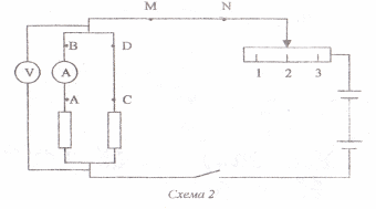 1. Поставте бігунок реостата в положення 1. Виміряйте напругу на ділянці кола KL та сили струму IAB, ICD, IMN, вмикаючи по черзі амперметр між точками A іB, Cі D, M іN.