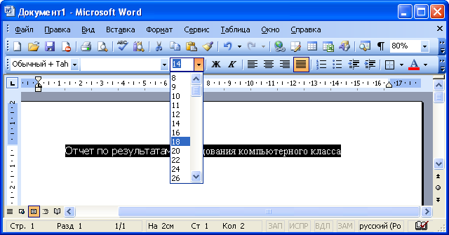 Размер шрифта (высоту символов) устанавливают в раскрывающемся списке Размер панели инструментов Форматирование (рис. 3). Размер указывается в пунктах (1пт ≈ 0,35 мм). Если подходящего размера в списке нет, то необходимо щелкнуть левой кнопкой в поле раскрывающегося списка, ввести требуемое значение размера и нажать клавишу клавиатуры Enter. Размер шрифта может быть установлен в пределах от 1 пт (0,3528 мм) до 1638 пт (578 мм) с точностью 0,5 пт.