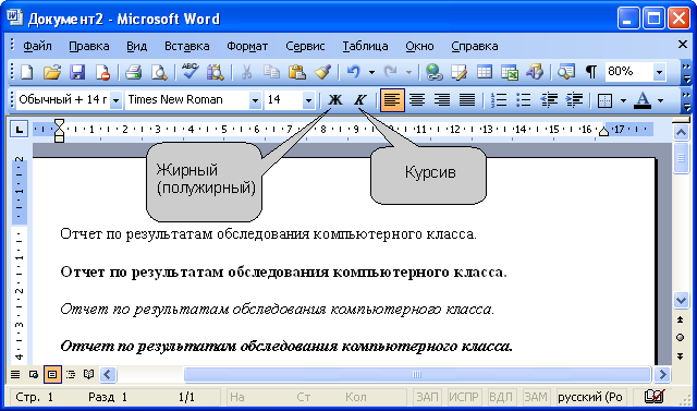 (полужирного) начертания и курсива