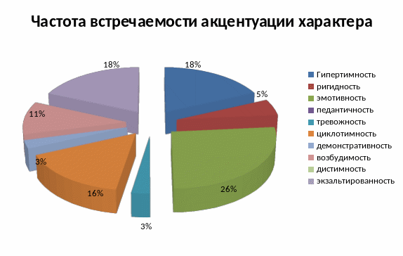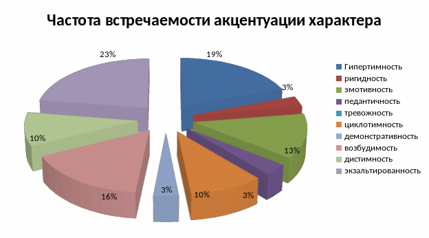 На основе этих данных следует отметить, что чаще всего встречаются такие акцентуации характера, как экзальтированность, эмотивность, гипертимность и циклотимность.