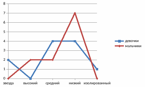 Как мы можем видеть из схемы (Рис.3), разброс статусов среди девочек больше, среди девочек меньше низкостатусных учащихся и также есть учащиеся, занимающие самый высокий статус в классе. Это говорит о том, что девочки в классе более общительны и вызывают довольно много симпатии. Среди мальчиков же больше низкостатусных учащихся, но при этом у них нет изолированных, что также говорит о том, что мальчики общаются между собой, хотя нельзя говорить о высоком уровне удовлетворенности общения.