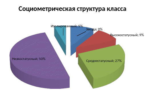 Таким образом, из социограммы и представленной диаграммы мы можем видеть, что большая часть учащихся в классе занимают низкое положение в классе (т.е. являются низкостатусными).