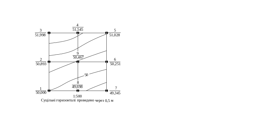 Завдання: за даними журналу нівелювання (табл..2) обчислити висоти пунктів будівельної сітки; перенести значення висот на план і викреслити горизонталі через 0,5 м.