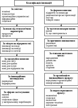 Слід звернути увагу на те, що виділяють наступні класифікаційні ознаки інновацій: за змістом; у залежності від технологічних параметрів; за місцем на підприємстві; за масштабом новизни; за інноваційним потенціалом; за сферою застосування; за формою новизни; за причиною виникнення; за частотою використання; за етапами життєвого циклу; за організацією інноваційного процесу та за видом отриманого ефекту.