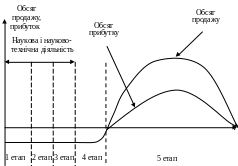 При вивченні теми слід звернути увагу на те, що в світі поширені два підходи до поняття «інновація»: статичний та динамічний. Останній пов’язаний з поняттям інноваційного процесу (процесу перетворення наукового знання в інновацію), який слід уявити як поступовий ланцюг подій, коли інновація визріває від ідеї до конкретного продукту, технології або послуги та розповсюджується у практичному використанні. Виділяють наступні етапи інноваційного процесу: фундаментальні дослідження, прикладні дослідження, дослідно-конструкторські і експериментальні розробки, виробництво та комерціалізацію (рис. 3.1).