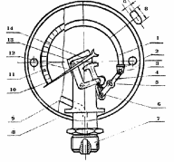 Секторно-зубчатый передаточный механизм состоит из тяги 4, соединённой с концом трубки посредством шарнира 3, сектора 10 с осью вращения 9. Тяга 4 с осью вращения 5 соединена с сектором 10 шарнирно винтом 6. Зубчатый сектор находится в зацеплении с шестернёй 14. На оси шестерни жестко укреплена стрелка 12. С осью шестерни соединена пружина 13. Другой конец пружины крепится на основание корпуса 8. Пружина предназначена для уменьшения вариации в передаточном механизме. Изменением расстояния от оси 9 до винта 6 зубчатого сектора подгоняют показания прибора в конечной точке шкалы 11.