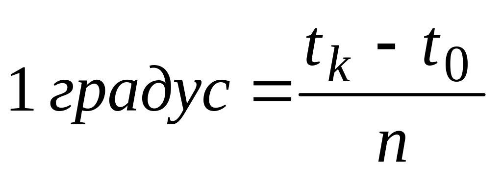 Международной практической температурной шкалой в 1948 году была принята стоградусная шкала Цельсия (оС). Для построения шкалы Цельсия взяты точки плавления льда t0 = 0оС и кипения воды tк = 100оС в нормальных условиях.