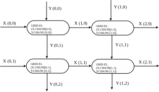 В этом примере реализована двумерная пространственно-временная структура, в которой имеются два двумерных массива каналов X.CHANS и Y.CHANS, и реализована параллельная вложенная конструкция PAR, в которой процессы создаются при вызове процедуры GRID.EL.