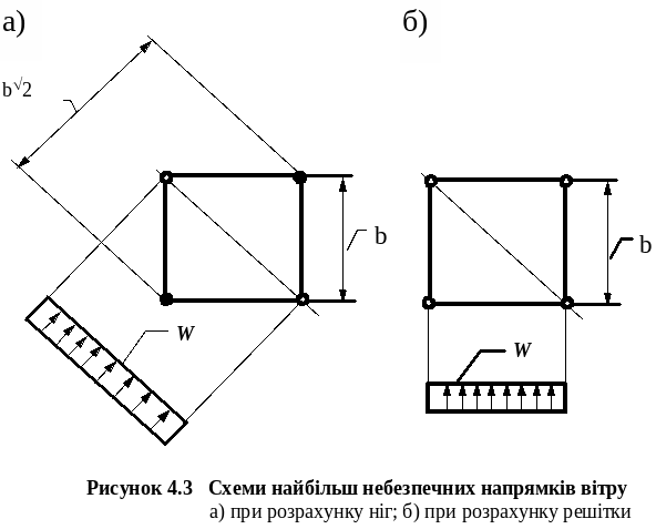 Максимальне зусилля N2i в нозі вежі від вітру будуть коли навантаження спрямовано на ребро вежі і в роботу на згин включаються тільки два пояси (див. рис. 4.3,а)