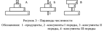 Для графического изображения трофических взаимоотношений между организмами в экосистеме используют экологические пирамиды. Они отражают такие характеристики экосистемы как численность, биомассу, энергию экосистемы. В основании пирамиды всегда располагаются продуценты, выше них остальные группы организмов. В большинстве случаев в пирамиды не включают редуцентов, поэтому на вершине пирамиды располагаются хищники. На представленном рисунке 3А приведен классический вариант пирамиды численности, однако, в некоторых случаях пирамида численности может иметь другие варианты (рис. 3Б, В). Приведите примеры цепей питания, которые соответствовали бы данным пирамидам.